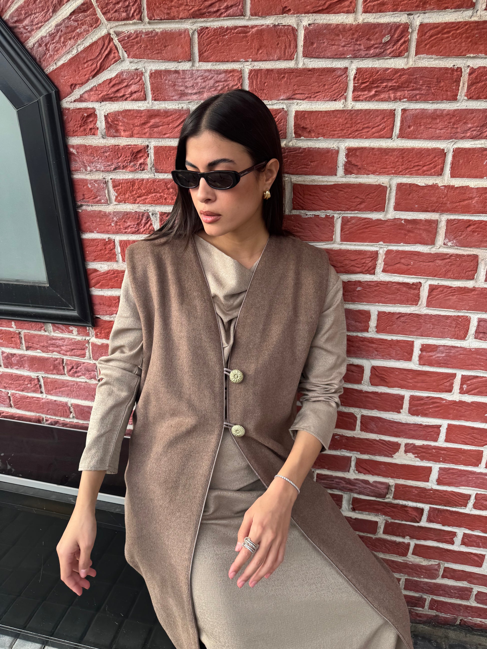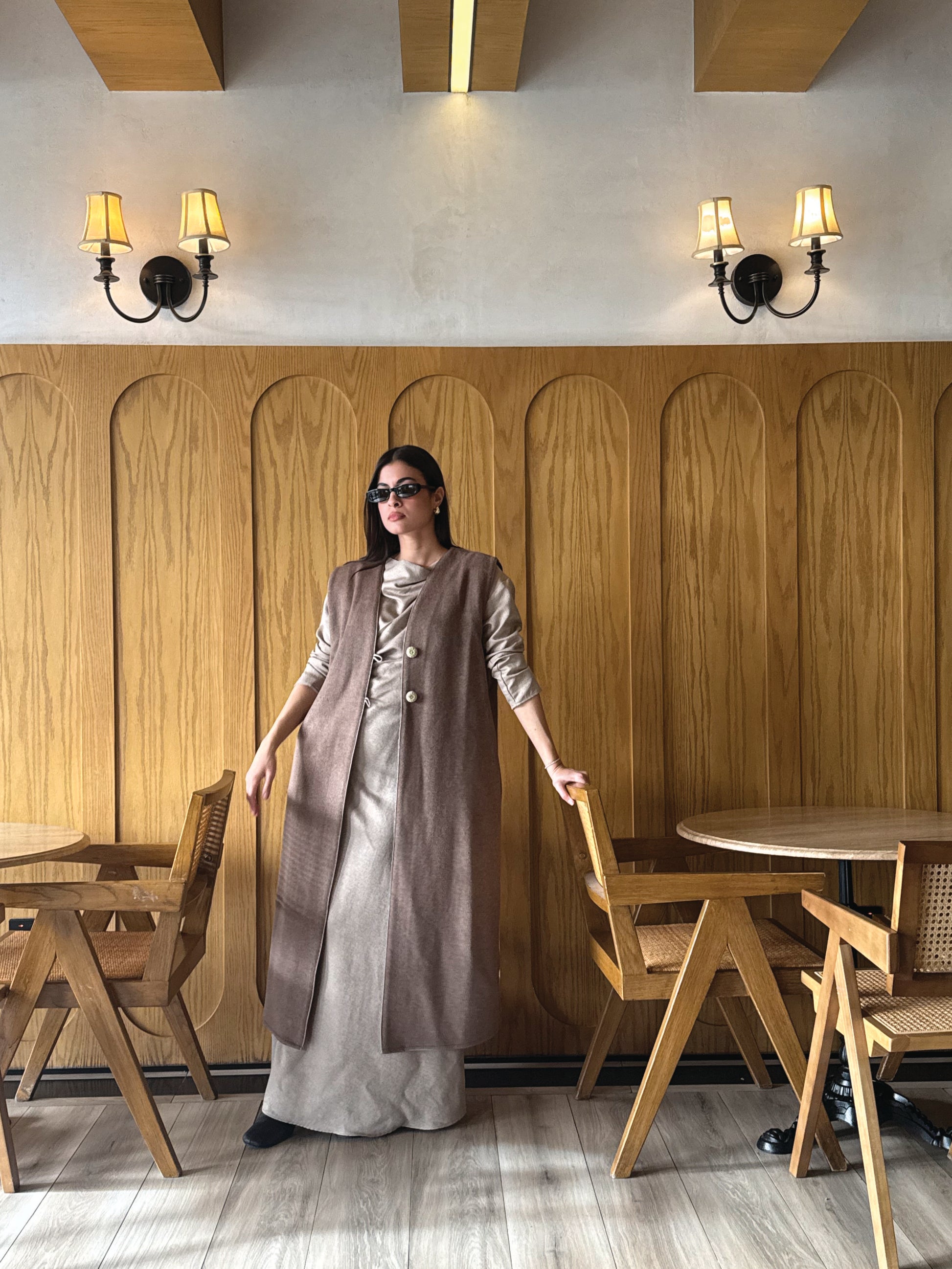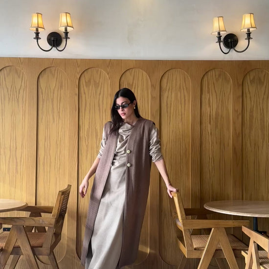 Paired with a minimal inner dress that moves effortlessly with the body, the set feels elegant and easy to wear casual or refined depending on how you style it!